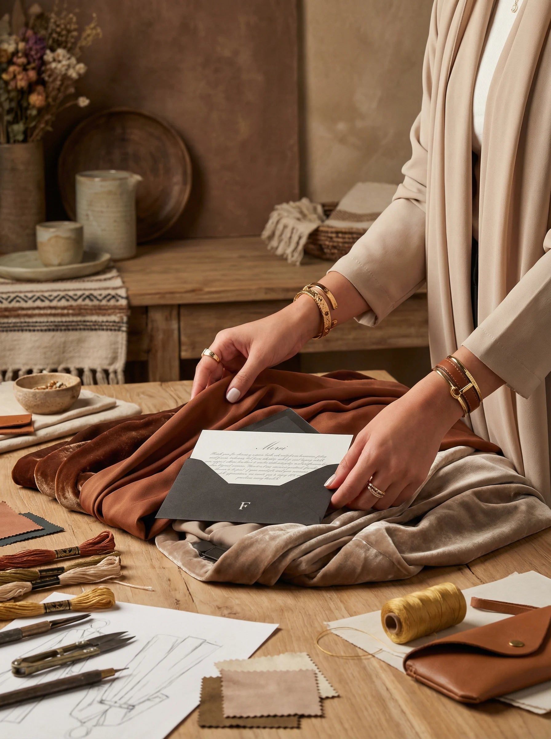 Every fabric is chosen for its character, every stitch placed with purpose. Crafted in the UAE, our pieces reflect patience, precision, and the beauty of hand-finished detail.